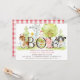 Invitation de baby shower de garçon sur le thème de la ferme avec animaux de ferme. Le dos de l'invitation a un motif en vichy rouge.