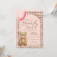 Jetez le plus doux baby shower We Can Bearly Wait girl avec cette adorable invitation d'ours aquarelle. Une arche en ivoire souple encadre vos détails de douche, tandis qu'un ours en peluche mignon tenant un ballon rose ajoute charme et douceur. Le décor est composé d'un motif en plaid en vichy chocolat, ce qui donne à l'ensemble une atmosphère cosy et intemporelle. Parfait pour fêter son petit petit bouvard, cette invitation donne le ton d'un baby shower joyeux et élégant. Customisez le texte pour qu'il corresponde aux détails de votre fête, puis jumelez-le avec les éléments essentiels de l'événement comme les cartes de remerciement, les faveurs de la fête et l'affichage de la suite de coordination. Avec son mélange de charme aquarelle, de en vichy marron et d'accents roses ludiques, ce design est la façon la plus agréable d'accueillir une petite fille.