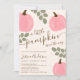 Une mignonne petite fille citrouille baby shower invitation. Cette invitation baby shower d'automne moderne comporte une police de script de calligraphie branchée, des citrouilles roses et des branches vertes d'Eucalyptus.