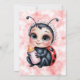 Une illustration charmante d'une petite fille habillée en coccinelle, tenant une bouteille de bébé rose et souriant doucement. Elle est accompagnée d'un papillon coloré avec des ailes de coccinelle, ajoutant une touche fantaisiste et magique. L'arrière - plan présente des bulles d'aquarelle rose et douce qui donnent au design une atmosphère rêveuse et joyeuse. Parfait pour les thèmes baby showers, la décoration de pépinière ou les invitations pour une petite fille en chemin.