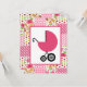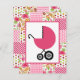 Une invitation à la baby shower d'une fille illustrant un chariot de bébé rose vif sur un dessin arrière - plan qui comprend des pois, des zigzags, des paisley, des roses, des en vichy et des rayures. Personnalisez le texte en arrière avec les détails de votre occasion.