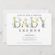 Baby shower virtuel longue distance par la poste. Elégante et chic, simple et moderne invitation baby shower, avec des lettres d'alphabet doré avec des fleurs botaniques feuillage. L'arrière est décorée de belles aquarelles florales aux couleurs violettes et bleues.
