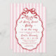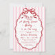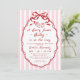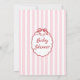 Baby shower Fraise rouge Fraise à la main Invitation baby shower simple et sucré sur le thème de la baie avec deux fraises, un arc et cadre ovale décoratif sur un arrière - plan rayé blanc et rose vif. L'arrière de l'invitation comprend le motif rayé et le cadre.