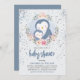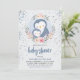 Baby shower Invitation met en vedette maman et bébé pingouin sur un arrière - plan bleu et des arrosages de fausse parties scintillant. Personnalisez avec les détails de la fête.