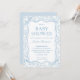 Célébrez le baby shower chic vintage parfait. Le design est orné d'un doux motif floral bleu évoquant une atmosphère calme et accueillante. Le point central de l'invitation est un en-tête gracieux de style calligraphie. Les fleurs bleues d'inspiration vintage et douce complètent l'esthétique générale et élégante, faisant de cette invitation un choix parfait pour une célébration de baby shower chic.