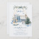 Invitations amis et famille à célébrer avec cette élégante invitation de baby shower en pépinière d'hiver bleu. Doté d'un lit confortable avec une literie bleue molle, d'un ours en peluche, d'un cheval à bascule, d'une pelouse de rennes et d'un sapin de Noël étincelant, ce design allie charme boisé rustique et style de vacances festives. Des arrière - plans rayés et des verdure dépoli en font le choix idéal pour une invitation à baby shower d'hiver, une arrosage de vacances ou un invitation baby shower neutre pour les deux sexes. Personnalisez avec les détails de votre événement pour créer un souvenir aussi intemporel qu’émouvant. Célébrez la joie de la saison avec cette invitation de baby shower boisé d'hiver qui est confortable, festif, et plein de charme.