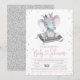 Invitation baby shower d'éléphant fille avec adorable princesse d'éléphant bébé portant une couronne sur un coussin sur un arrière - plan parties scintillant argent. Cette invitation de baby shower d'éléphant fille est facilement customisée pour votre événement en ajoutant simplement vos détails. Impossible de modifier le texte du baby shower.