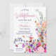 Un petit fleur sauvage est en route ! Illustration moderne de fleurs d'été de printemps avec jolie fleur sauvage et script de brosse baby shower invitation avec la typographie de calligraphie moderne avec rouge, violet, rose, fleurs de terre cuite sur blanc