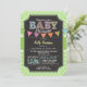 Invitation baby shower neutre avec joli tableau de bord look police sur citron vert brillant motif Quatrefoil. Polices de craie vintage sur l'arrière - plan de tableau noir cool avec drapeaux de bottes colorés rose, orange, violet et vert pois.