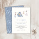 Célèbre le baby shower avec notre mignonne aquarelle minimaliste Noël hiver bébé vêtements thème baby shower côté face avec décoration de pull bleu bébé avec petit lapin lapin, casquette d'hiver rose, chaussette de Noël rose et bleu, gingerpain maison cookie accroché sur la ligne de toilette, et "c'est une fille" texte. Dos avec pois blancs sur motif arrière - plan bleu poussiéreux. Décor couleur bleu, rose, crème et beige. Customisez votre propre texte.