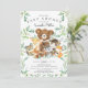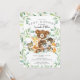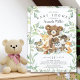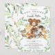 Un design de baby shower mignon mettant en vedette le plus doux ours assis sur une souche d'arbre entouré d'un cerf, un raton laveur, un écureuil, un renard, un orignal et un renard. Encadré de feuilles de aquarelle verte naturelle sur fond blanc. Retournez notre invitation pour voir un dos assorti de feuilles vertes pour un effet spécial.