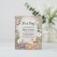 Baby shower d'hiver rustique et abordable avec des aquarelles mignonnes d'animaux boisés, des fleurs, de la verdure et un couvert d'étoiles dorées et de flocons de neige. "C'est un garçon !" ou "C'est une fille !" et le nom de la future mère est écrit dans un script vert chasseur.
