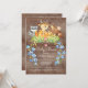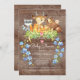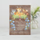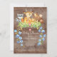 Un baby shower boisé à l'aquarelle mignonne avec un cerf, renard, ours, raton laveur et hibou avec des fleurs feuilles et bleues sur un arrière - plan rustique en bois marron. Parfait pour un baby shower pour garçons