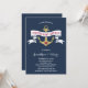 Cette invitation baby shower de couples nautiques comporte une fausse ancre de parties scintillant or, une bannière vintage bleue et blanche, un coeur rouge mignon et un arrière - plan bleu marine.