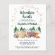 Une invitation à baby shower pour les couples rustiques et économiques avec une jolie illustration des animaux des bois avec leur tente campant dans les montagnes et la forêt, une superposition d'étoiles dorées et "Adventure Awaits" et les noms de la mère et du père dans un script vert foncé.