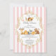 Des animaux de bois aquarellés et adorables, posés sur un arrière - plan à rayures roses et blanches avec un cadre doré de fantaisie. Disponible dans notre boutique pour un baby shower garçon ou un baby shower neutre.
