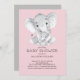 Invitation baby shower éléphant avec en niveaux de gris maman & bébé girafe sur un arrière - plan rose pour un baby shower de filles. Retournez notre invitation pour voir un arrière - plan gris coordonné pour une touche spéciale supplémentaire. Visitez notre boutique pour voir les articles correspondants.