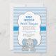 Cute Blue Elephant Grey Arrière - plan Invitation Baby shower. Dispose d'un adorable éléphant aux oreilles bleues et rayures bleues