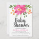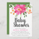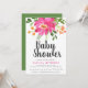 Une invitation au baby shower moderne, colorée et lumineuse avec un grand bouquet de fleurs d'aquarelle en rose, orange et vert tropicaux. L'expression "douche nuptiale" est en police gris foncé de style moderne, invité d'honneur en rose fuchsia, et détails de l'événement en gris dans le tiers inférieur de l'invitation. L'arrière de l'invitation est en vert massif.