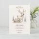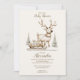 Célébrez un baby shower d'hiver avec cette adorable invitation boisée, avec un renne beige doux tirant un traîneau en bois plein de cadeaux à travers une forêt enneigée. Des sapins gelés neutres et des détails minimalistes de chutes de neige créent une scène sereine et neutre pour les réunions de vacances. Un charmant mélange de chaleur rustique et de simplicité scandinave.