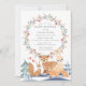 D'adorables animaux en bois d'hiver sont décorés dans un motif d'art folklorique. Une jolie couronne bleue et or aux accents rouges entoure les détails du baby shower. Les animaux des bois sont nichés dans une scène hivernale avec des arbres et des collines. Les animaux comprennent un ours, un écureuil, un lapin, un renard et des oiseaux.
