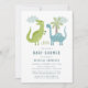 Belles invitations à la douche bébé dinosaure avec dinosaures verts et bleus avec un arrière - plan de nuages, un palmier et de l'herbe verte. Personnalisez les invitations pour les douches pour bébés dinosaures en ajoutant le nom et les détails de la douche de la maman. L'invitation revient à un motif de dinosaures verts, bleus, oranges, menthe et coraux rouges avec palmiers et feuillage. L'invitation est parfait pour les bébés garçons que maman attend !