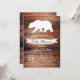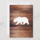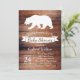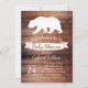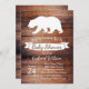 Invitation baby shower rustique avec une ambiance rustique chaleureuse de planches de grange et silhouette d'ours. La face arrière est ornée d'une autre silhouette d'ours.