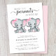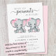 Une invitation à la douche avec "Two Sweet Little Peanuts Are On Their Way" écrit dans une typographie moderne gris doux et un script élégant, et deux aquarelles rose pastel d'éléphants. Personnalisez le nom de la future mère et les détails de la douche dans une simple typographie grise.