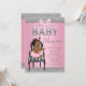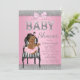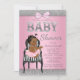 Invitation baby shower rose et argent avec adorable petite fille afro-américaine portant un joli tutu rose et un chapelet de perles assis sur une chaise rayée noire et blanche chic sur un élégant arrière - plan parties scintillant rose et argent. Cette invitation au baby shower moderne rose et gris argenté est facilement customisée pour votre événement en ajoutant simplement vos détails dans le style de police et la couleur de votre choix. Vous pouvez supprimer la couleur rose arrière - plan et ajouter la couleur de votre choix. Il s'agit d'un design imprimé sans parties scintillant réelle, arcs, etc.