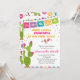 Célébrez votre petite señorita avec cette Invitation de Baby shower Fiesta colorée. Doté d'un cactus vert festif aux fleurs roses, d'une bannière picado au papel brillant, de maracas ludiques et de touches de confetti vibrantes, cet aménagement est parfait pour un baby shower mexicain à thème boho. Idéal pour les fêtes d'été. BBS203