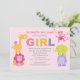 Cette invitation colorée pour une baby shower présente une pile ludique d'amis animaux de la jungle — lion, girafe, singe, éléphant et hippopotame — entourant le mot "FILLE" en gras dans des couleurs vives de l'arc-en-ciel. Le thème amusant de safari est parfait pour la célébration d'une petite fille, avec des accents roses, orange, verts, violets et gris partout. Un fond à pois rose coordonné complète le design recto-verso. Tout le texte est entièrement personnalisable pour votre événement.