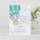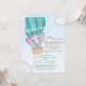 Ce baby shower fantaisiste sur invitation par la poste présente un adorable petit éléphant en violet volant au milieu des nuages dans une montgolfière turquoise sur un arrière - plan bleu aquarelle. Facile à personnaliser avec des options personnalisées en cliquant sur le bouton "Personnaliser".