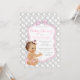 Invitation à une baby shower avec une adorable petite fille portant un pantalon rose à volants et un collage de perles sur un fond de perles touffues magnifique avec un joli fond de ruban argent et rose. Cette invitation de baby shower à thème perle rose et gris est facilement personnalisable pour votre événement en ajoutant simplement vos détails dans le style de police et la formulation de votre choix. Il s'agit d'un design imprimé sans perles réelles, touffes, paillettes, etc.