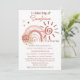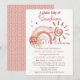 Éléments boho soleil, arc-en-ciel, lune et étoiles avec bouquet de fleurs roses et de graminées séchées "Un petit rayon de soleil est en route" conception de baby shower fille par la poste. Caractéristiques des nuances de rose et de terre cuite moyenne et foncée sur fond blanc. Le dos présente un fond pointillé irrégulier rose et terre cuite foncée pour coordonner avec les pointillés de l'arc-en-ciel sur le devant. Conception composite par Holiday Hearts Designs.