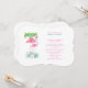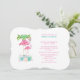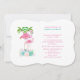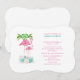 Une invitation à une baby shower avec une illustration d'un couple de flamants roses (maman et bébé) debout sur un bouquet de fleurs pastel. Des palmiers verts se balançant à l'arrière. Tropical et joli.