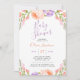Invitations de douches pour bébé imprimées sur mesure et abordables, avec des polices et des couleurs modèles et entièrement modifiables. Cet élégant design présente une bordure florale d'aquarelle féminine aux couleurs pastel rose et violet. Personnalisez-le avec vos détails de baby shower. Reverse side a un arrière - plan d'aquarelle abstrait où vous pouvez ajouter vos propres photos ou du texte supplémentaire si nécessaire. Utilisez les outils de conception pour ajouter des photos, customiser les polices de texte et les couleurs pour créer une conception d'invitation de baby shower unique.