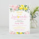 Cette adorable invitation présente des citrons colorés à l'aquarelle, des fleurs roses et des confettis de feuille d'or imitation.