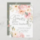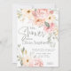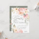 Invitation rustique et élégante de baby shower rustique avec un bouquet floral en cascade de roses pastel pastel, pivoines et feuillage dans les tons rose roux, pêche pâle et crème d'ivoire, avec des feuilles botaniques vert doux et la végétation d'eucalyptus et une touche de feuilles flânés d'or, accentuée de calligraphie de style manuscrit. Utilisez notre modèle facile à customiser pour personnaliser avec vos détails de baby shower - le dos est un vert muet riche avec un beau bouquet de fleurs assorties. ©WhimsicalArtwork™