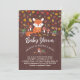 Charmant baby shower de bois, avec un adorable renard dessiné à la main, assis parmi les tabourets, les rochers mousseux, les glands et les feuilles d'automne colorées. Le baby shower est écrit dans un script de brosse blanche. L'arrière - plan est une texture de grain brun chaud.