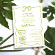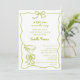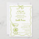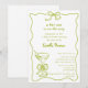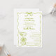 Voici le carton d'invitation "Tini One on the Way" funky et fantaisiste à l'occasion d'une baby shower, dessiné à la main avec un thème Dirty Martini, en vert et blanc – une invitation tendance et ludique pour célébrer la future maman ! Avec un cadre ondulé orné d'un charmant nœud coquet, ce design est accentué d'un dirty martini dessiné à la main avec trois olives dans le coin inférieur. Le fond blanc épuré laisse la combinaison de l'écriture manuscrite et des polices de caractères funky briller, créant une ambiance amusante et élégante. Parfait pour donner le ton d'une baby shower inoubliable avec amis et famille. Personnalisez facilement ce modèle avec les détails de votre événement. Également disponible en téléchargement numérique instantané pour un partage facile par e-mail, SMS ou sur les réseaux sociaux.