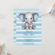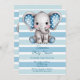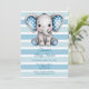 Célébrez l’arrivée d’un bébé avec cette douce aquarelle illustrant un bébé éléphant aux oreilles de pois bleues, joues roses et fleurs joueuses sur un arrière - plan rayé bleu et blanc. Parfait pour les invitations à la douche pour bébé, la décoration de fête ou l'art de la crèche.