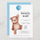 Une invitation baby shower "on peut attendre longtemps" avec un ours en peluche et un ballon bleu pour un bébé garçon. Objets correspondants disponibles dans la collection Thème du Baby shower de l'ours en peluche.