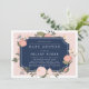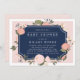 Une élégante invitation au baby shower floral présente une plaque bleu marine portant vos détails de baby shower et entourée de fleurs roses et crème, de verdure luxuriante et de petits bourgeons. Personnalisez avec vos détails de baby shower en lettres blanches élégantes. Les cartes renversent vers un motif de vignes subtil en rose vif et en ivoire.