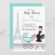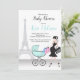 Invitation à thème Paris, élégante et stylisée. Tour Eiffel visuel et couleurs génériques font un merveilleux thème de Baby shower pour votre célébration.