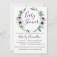 Cadre géométrique or avec fleurs d'anémones, branches de fougères et feuilles d'eucalyptus, invitation baby shower. Customiser le style de police, la couleur et la taille.