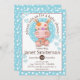 Jolie patchwork hippo invitation douche bébé avec blanc sur pois bleus et coeurs rayés bleus.