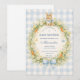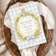 Un charmant design de baby shower vintage mettant en vedette un lapin à l'aquarelle sucré reposant au-dessus d'une délicate couronne de jardin printanier. Des marguerites douces, de la verdure et des petites carottes forment un cadre botanique fantaisiste, terminé par un nœud ruban doux et un fond à carreaux bleu clair. Le style d'illustration de conte de fées et la palette de campagne pastel créent une esthétique cottagecore intemporelle qui se sent chaleureuse, ludique et parfaite pour célébrer l'arrivée d'un nouveau petit.