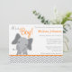 Une invitation orientée moderne de baby shower d'éléphant gris et orange. Perfectionnez pour un baby shower de petit garçon.