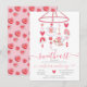 Invitations modernes et mignonnes Valentines Day Baby Shower. Dispose d'un chéri anges, des coeurs de bonbons, des pompons, des arcs-en-ciel et des étoiles accrochés sur un mobile de style boho. Parfait pour un baby shower près de Valentines Day ou toute autre journée avec beaucoup d'amour! Couleurs blanches, roses et rouges.