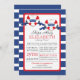 Baby shower nautique moderne rouge, blanc & bleu invitation à la douche pour bébés jumeaux. Notre baby shower contemporain Ships Ahoy jumeaux offre deux coeur rayé rouge et blanc Buoy avec des bannières bleues avec le mot twins sur eux. L'arrière - plan est une bande horizontale bleue et blanche, audacieuse et brillante. Retourne l'invitation pour une bande correspondante. Visitez notre boutique pour voir ceci pour un baby shower pour garçons, un baby shower pour filles et un baby shower neutre pour le genre.